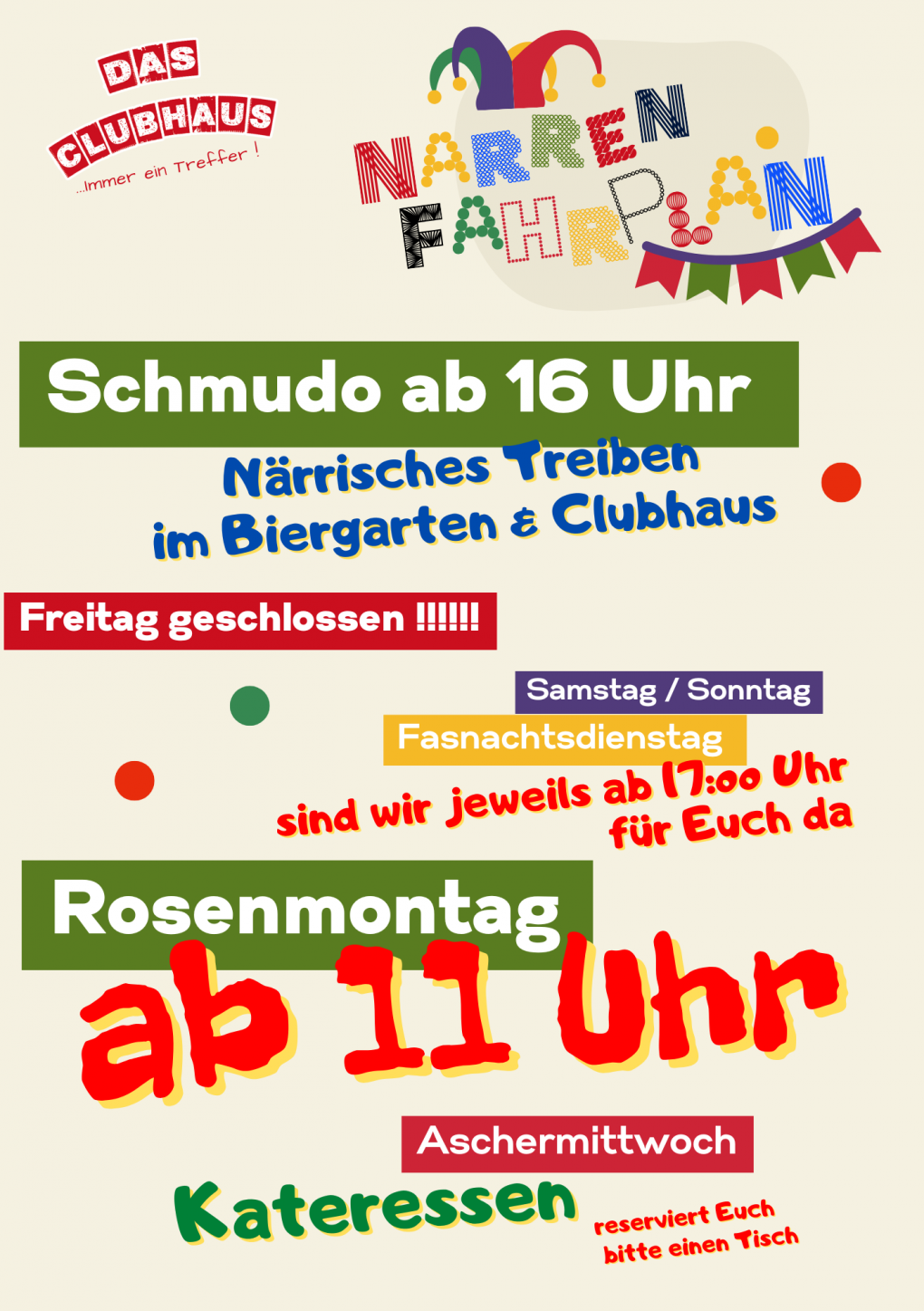Unsere Öffnungszeiten über Fasnacht findet ihr auf dem Bild. Bitte beachtet dass am Fasnachtsfreitag durch eine Geschlossene Gesellschaft das Clubhaus nicht geöffnet hat 🙂